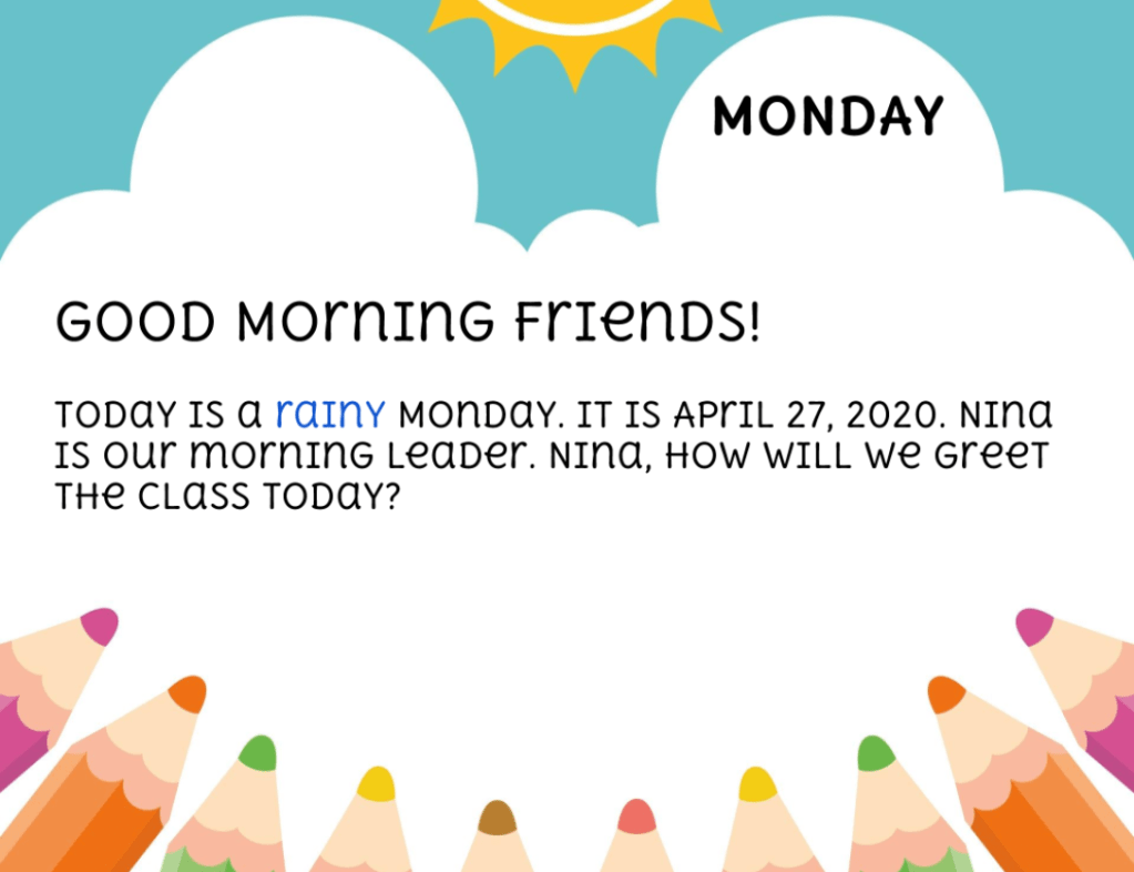 Then once everyone has entered the Zoom Meeting Room, you can begin by saying something like, “Good Morning friends! Today is a rainy Monday. It is April 27, 2020. Nina is our morning leader. Nina, how will we greet the class today?”