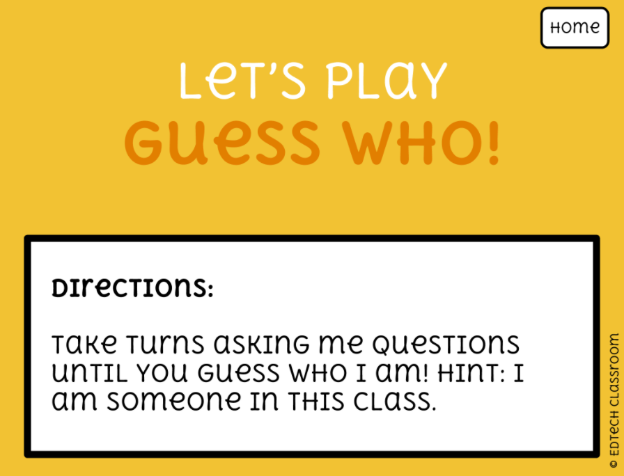 “Let’s play Guess Who! Take turns asking me questions until you guess who I am. Hint: I am someone in this class.”