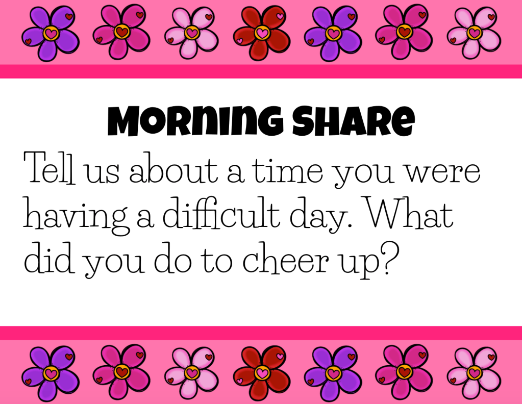 Then, you will move onto the share portion of the Morning Meeting. I really like shares that have a social-emotional lens to them because they allow students to reflect on how they are feeling. You can also share sillier prompts too (i.e. “Would you rather have a pet polar bear or a pet penguin?”).