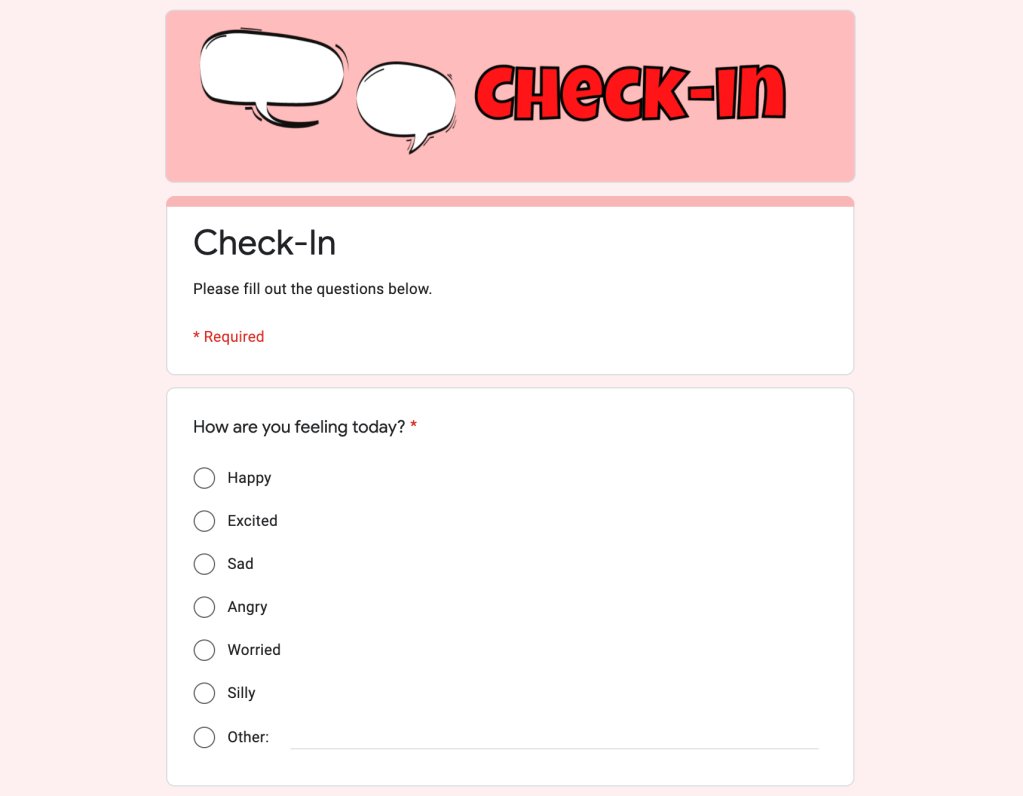 You can check-in with students daily using Google Forms. It is a simple and easy way to hear from students 1:1. You can ask students a multiple choice question like, “How are you feeling today?” with answer choices like “Happy,” “Excited,” “Sad,” “Angry,” “Worried,” and “Silly.” You can also include a long text response for students to share specific details or ways that you can support them.
