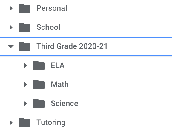 As a third grade teacher, I might have sub-folders for the different subjects I teach like Math, ELA, and Science.