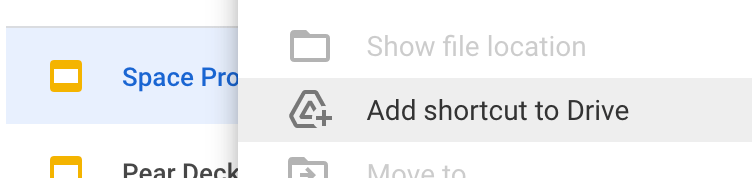 - Click “Add a shortcut,” and then select the shortcut location in your Drive.