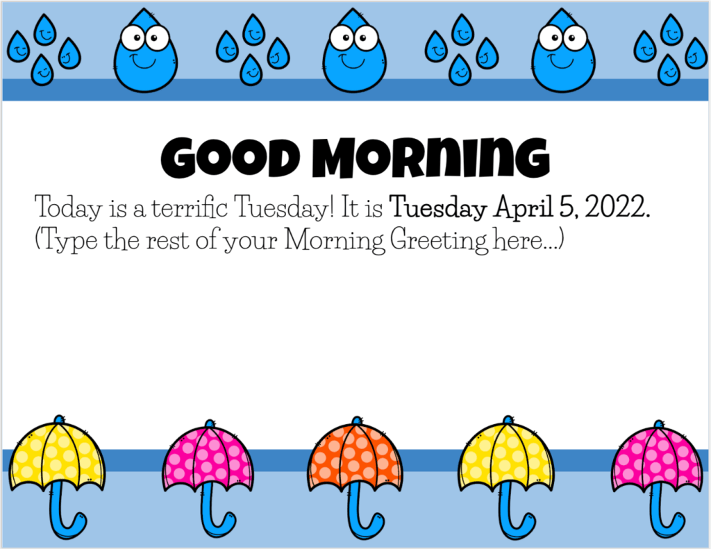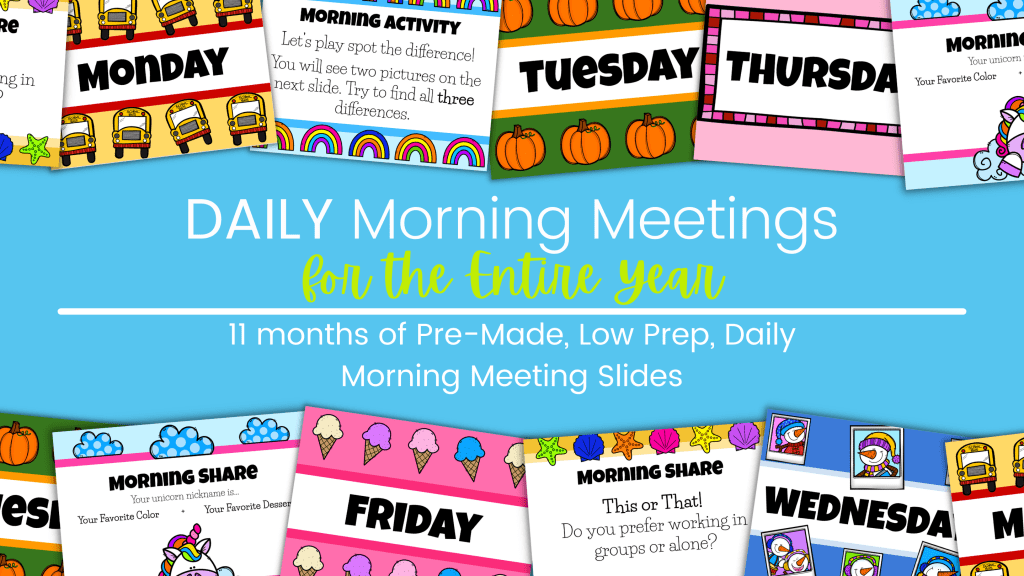 I made 11 months of pre-made, customizable, daily Morning Meeting slides to use with your students all year. If you’d like to check them out, click here!