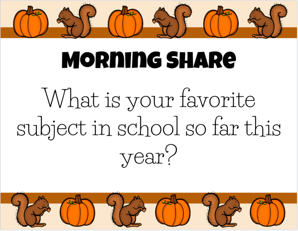 Each day offers a different Morning Share prompt that helps students to learn about each other and themselves.