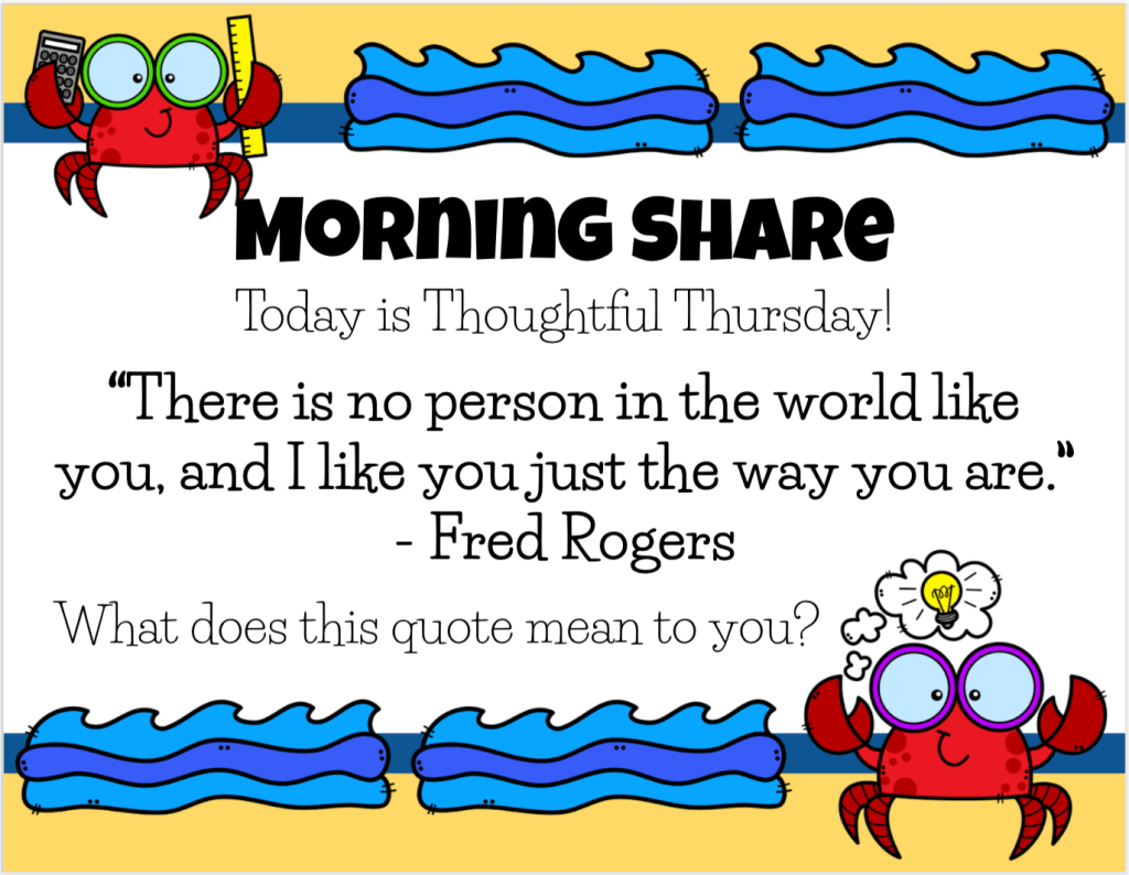 Morning Share is one of the best ways for students to reflect on their interests, learning, and growth. Some can be thoughtful prompts, such as asking students to share what this quote means to them: