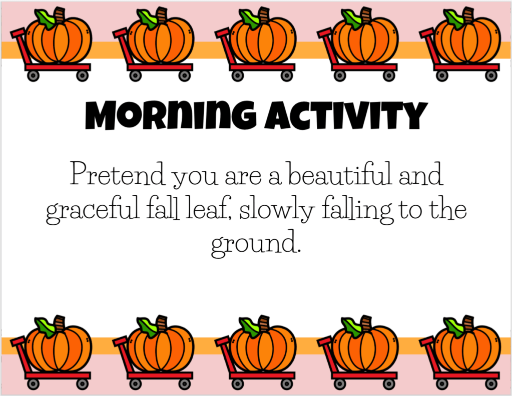 In the example below from the October slides, the activity states, “Pretend you are a beautiful and graceful leaf, slowly falling to the ground.”