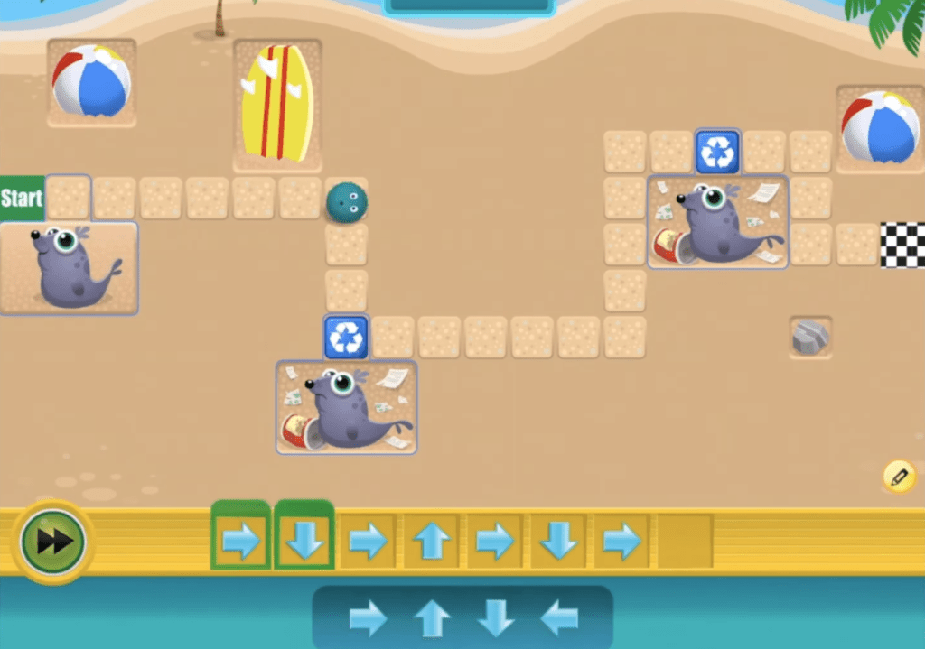 In Beach Cleanup, students will need to program their Fuzzes to collect 12 pieces of beach trash from the Fuzztopia beach. In doing so, students will rescue baby sea creatures and help them return to their families.