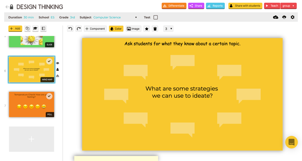 In the example above, I’ve created a mind map within LessonUp. Students can respond to a prompt or question (i.e. “What are some strategies we can use to ideate?”), and their ideas will populate on the screen. How amazing is that?!