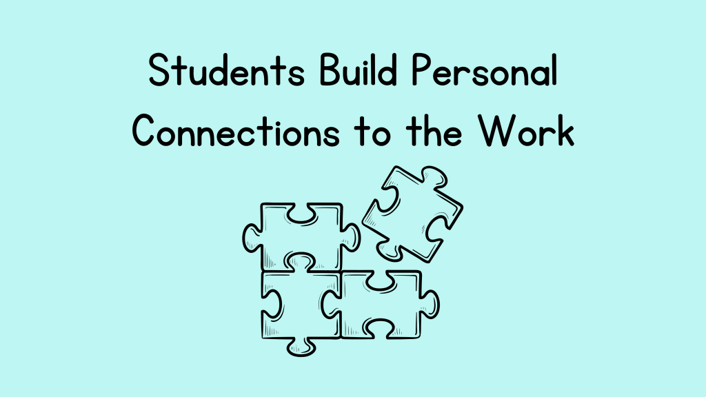In project-based learning, students can also build personal connections to their work, including their project topics. Through this process, students can “draw on their experiences, perspectives, and values” (6 Ways to Guide Students to More Authentic Work in PBL).