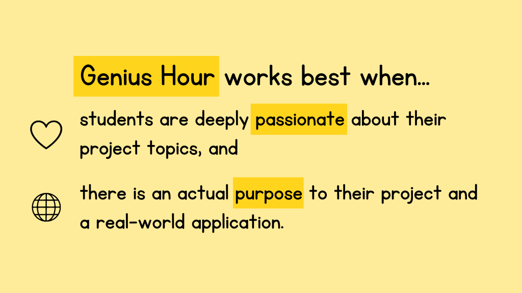 Genius Hour is the most effective when (1) students are deeply passionate about their project topics and (2) there is a purpose to their project and a real-world application.