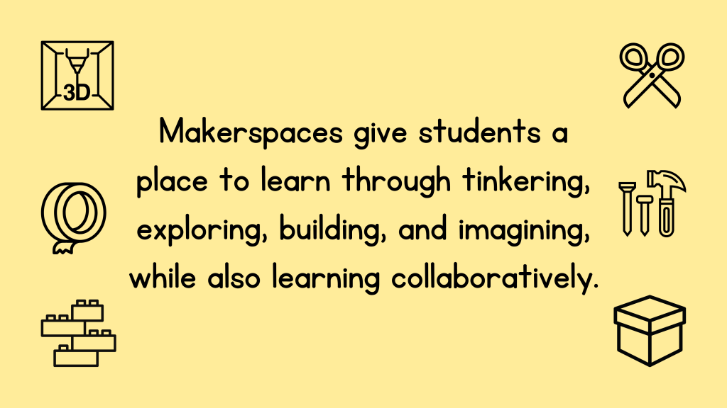 Makerspaces give students a place to learn through tinkering, exploring, building, and imagining – while also learning collaboratively (makerspaces.com).